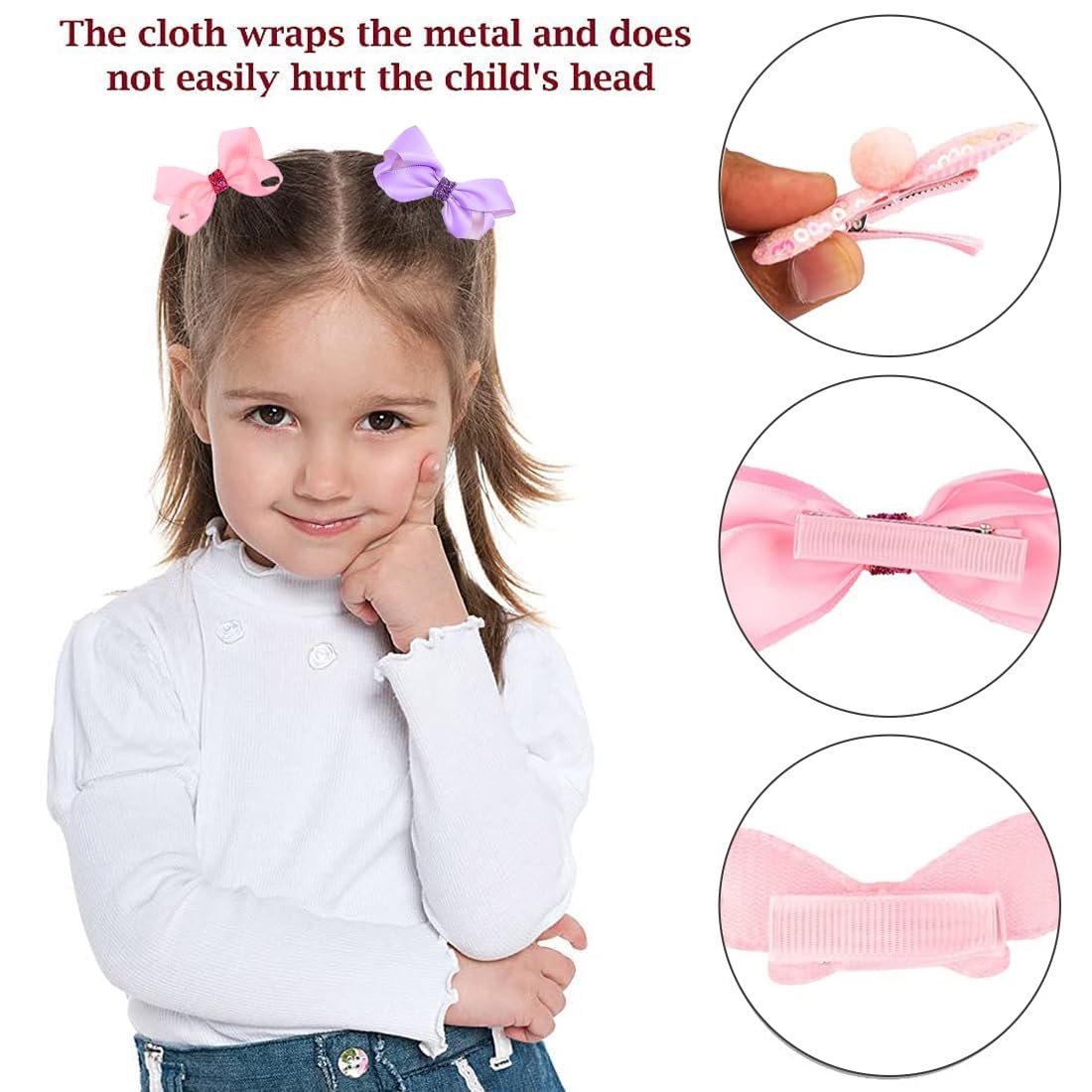 - Comfort and safety, the metal part of the clip is covered with a soft ribbon fabric to ensure that it will not hurt the hair and will not fall off easily. Girls hair clips ensures secure grip, prevents pulling, and is ideal for baby hair accessories for 0 to 2 years