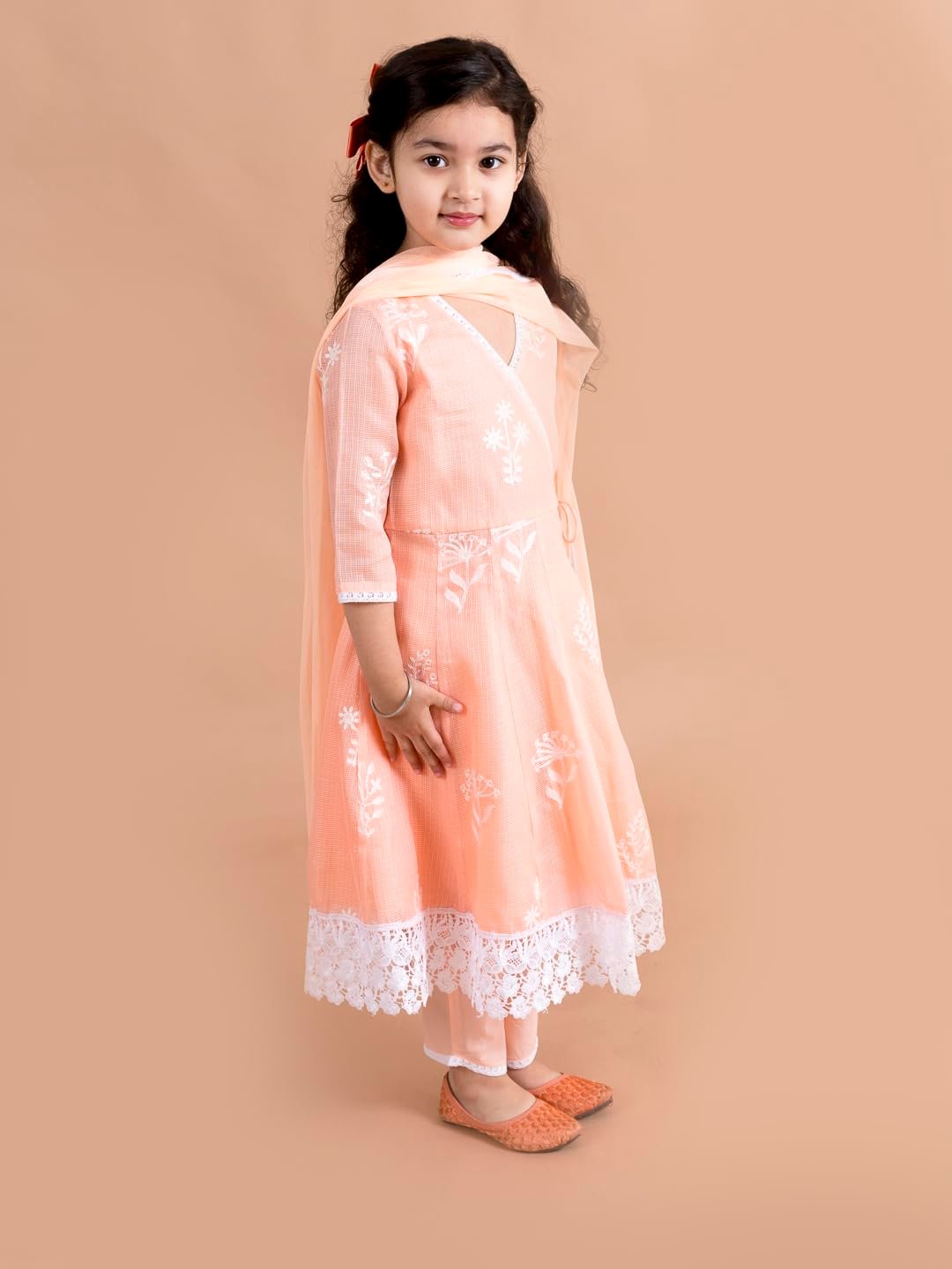 Pspeaches Girls Peach-Coloured Floral Printed Angrakha Pure Cotton Kurta With Trousers With Dupatta quantity